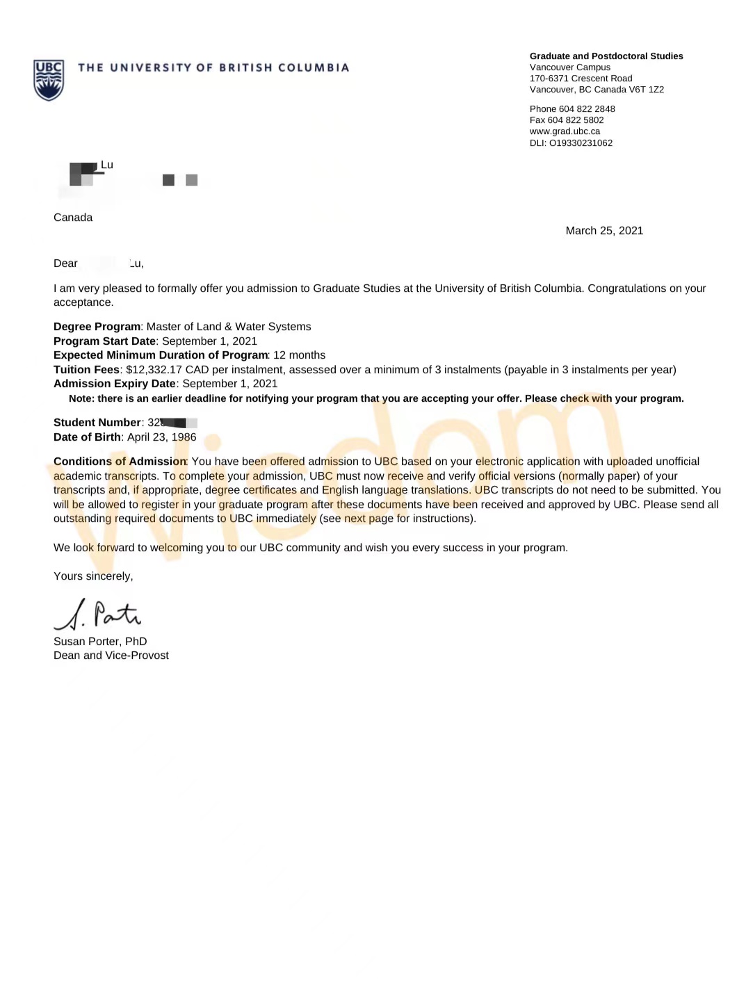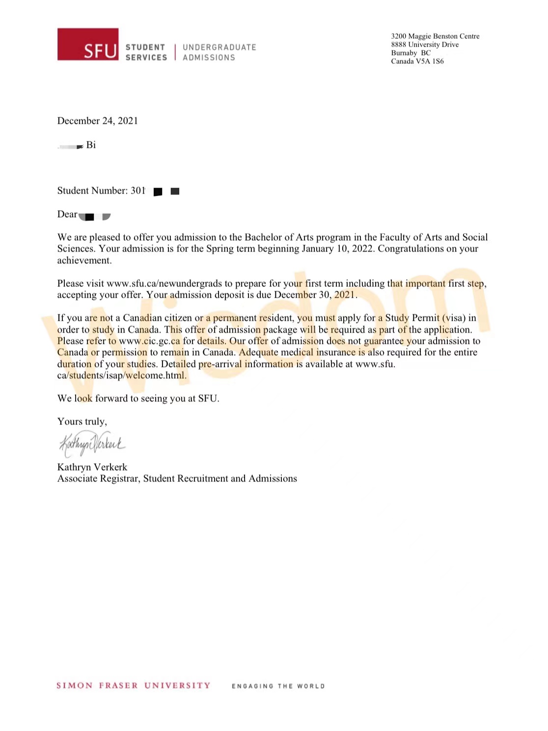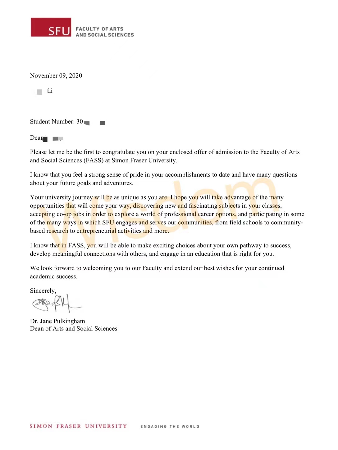 我高中来到了加拿大温哥华留学,一开始很不适应,选课上也没有规划,辗转了几家学校都没有取得一个理想的结果。一次机缘巧合下认识了博睿的顾问小姐姐,她在了解我的情况后为我制定了升学方案,最终我拿到了SFU的Offer!这两年的合作非常开心,太感谢博睿耐心、负责的顾问小姐姐啦。